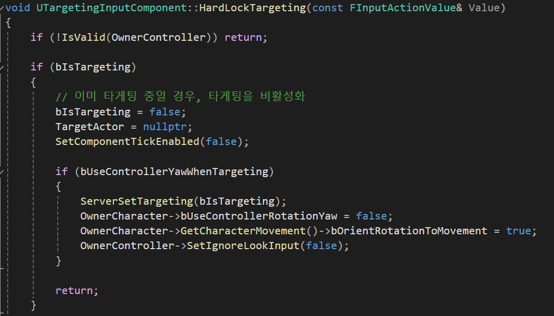 - 이미 타게팅을 하고 있는 경우, 타게팅을 비활성화하며 Tick() 함수 호출을 중지한다. 이때, 타게팅 중에 캐릭터가 타게팅한 액터를 바라보게 하는 옵션이 켜져있을 경우 Server RPC로 타게팅이 종료됨을 알리고 캐릭터가 컨트롤러의 Yaw 회전을 따라가지 않도록 설정한다. LookInput도 정상적으로 입력이 되도록 설정해준다.